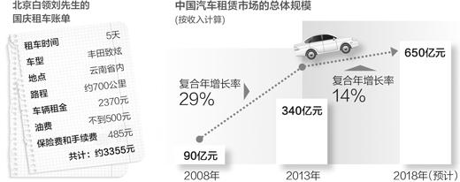 “空间还是很大的。”神州租车相关负责人说,根据一家知名管理咨询有限公司的资料,按收入计算,中国汽车租赁市场的总体规模由2008年的约90亿元增至2013年的约340亿元,复合年增长率为29%。预计到2018年,市场总体规模将进一步增至约650亿元,复合年增长率为14%。