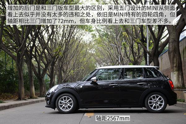 增加的后门是和三门版车型最大的区别,采用五门设计的MINI从侧面 看上去似乎并没有太多的违和之处,依旧是MINI特有的四轮四角,但轴距相比三门增加了72mm,但车身比例看上去和三门车型差不多。