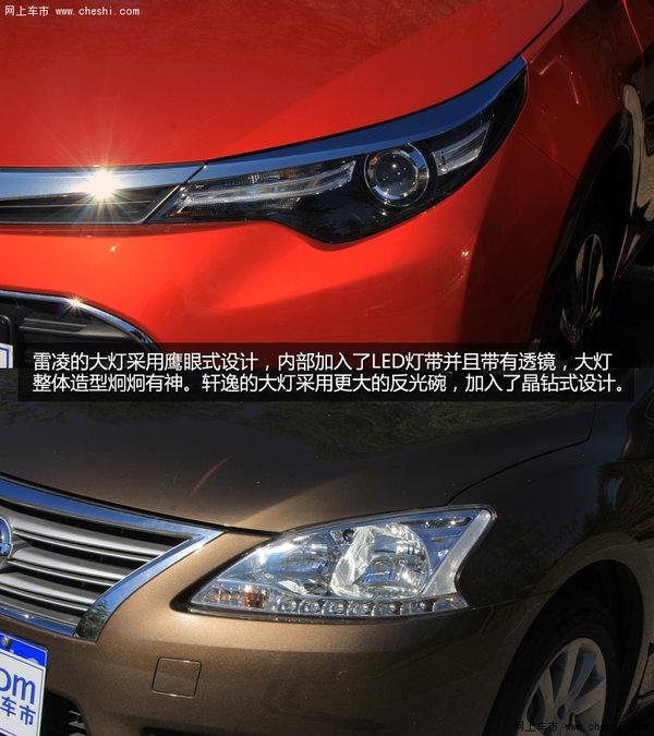 雷凌前脸的造型十分动感,一条银色镀铬装饰从车头一直延伸至大灯,下方的进气格栅造型夸张彰显个性。轩逸的前脸设计饱满许多,全镀铬式的中网提升了豪华感。雷凌的大灯采用鹰眼式设计,内部加入了LED灯带并且带有透镜,大灯整体造型炯炯有神。轩逸的大灯采用更大的反光碗,加入了晶钻式设计。