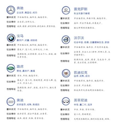 通过对比,奔驰车主个人收入最高,英菲尼迪车主家庭收入最低;路虎车主学历相对最低,沃尔沃车主学历最高;宝马车主女性比例最高,凯迪拉克车主男性比例最高;奥迪车主政府官员多,路虎车主个体户多;宝马和路虎最张扬,雷克萨斯车主身份不鲜明,沃尔沃最低调。