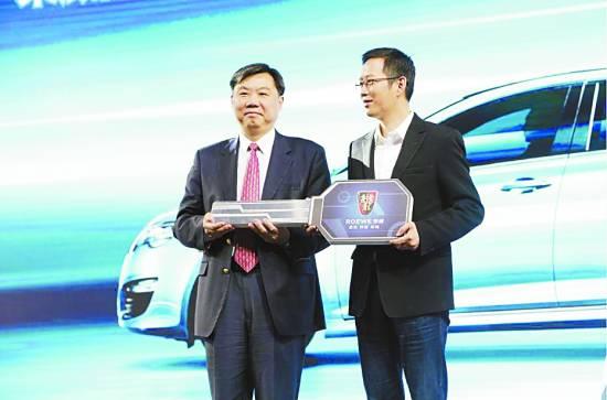 上汽集团董事长陈虹将荣威550 PLUG-IN车钥匙交给著名财经作家吴晓波,他也是荣威品牌的第70万位车主。
