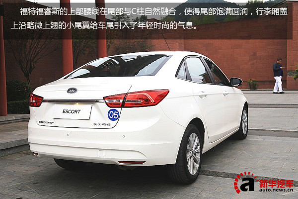 在车身设计上,设计师巧妙地将A柱位置向后移,拉长整个发动机舱,从视觉上营造出一种更高级,比例更协调的修长车身。福特福睿斯的上部腰线在尾部与C柱自然融合,使得尾部饱满圆润,行李厢盖上沿略微上翘的小尾翼给车尾引入了年轻时尚的气息。