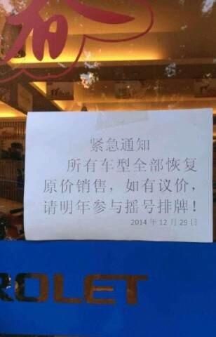 深圳当地的汽车经销商也以迅雷不及掩耳之势贴出了告示:“所有车型全部恢复原价销售,如有议价,请明年参与摇号拍牌。”