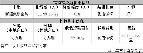 日前网上车市上海站从上海福银福特4s店了解到,目前该店福特福克斯优惠出售,详细请见下表: