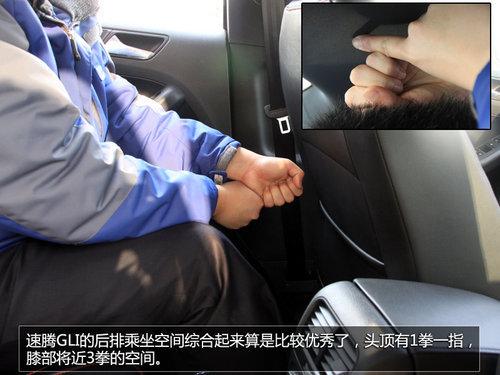 速腾GLI身为一款性能车型,能够有这样的驾驶空间已经很优秀了。身高1.75cm的驾驶者将座椅调整到最合适姿势,头顶仍然空余一拳两指。速腾GLI的后排乘坐空间综合起来算是比较优秀了,头顶有1拳一指,膝部将近3拳的空间。