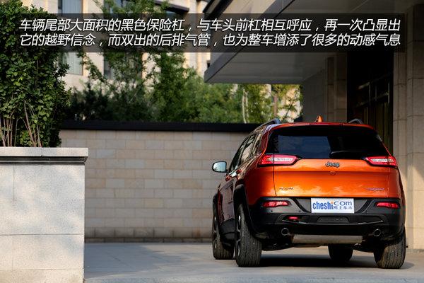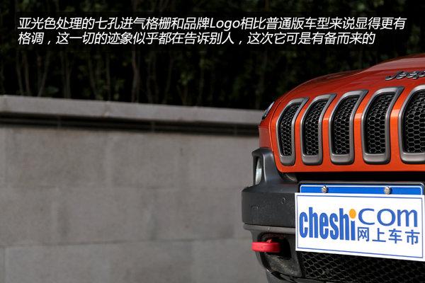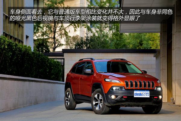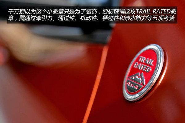 车身侧面看去,它与普通版车型相比变化并不大,不过正式因为这样,位于A柱下端的TRAIL RATED圆型徽章因此变得格外显眼,想要获得这枚,必须通过牵引力、通过性、机动性、循迹性和涉水能力等五项考验。同时,不与车身同色的哑光黑色后视镜与车顶哑光黑色的行李架涂装也是一项十分明显的特征。