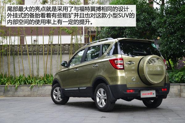 幻速S2是一款基于北汽威旺M20平台研发的产品,所以这也就解释了为什么这款车是后驱产品。当然,这款车还是比较地道的SUV产品,侧开式尾门以及外挂式备胎让这款小车野味十足,下部的包围也让幻速S2具备了不错的防护能力。但在外观设计上,幻速S2的确还要和前两位竞争对手潜心学习。