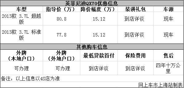 日前网上车市上海站从上海永达英菲尼迪了解到,目前该店QX70车型优惠出售,具体信息见下表: