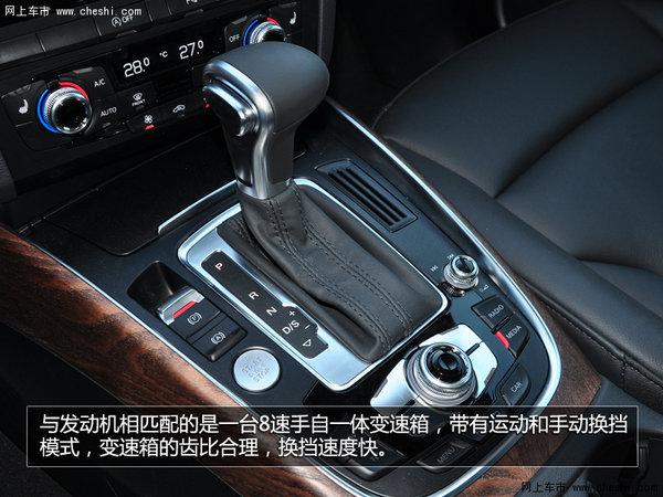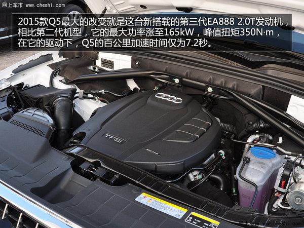 2015款Q5最大的改变就是这台新搭载的第三代EA888 2.0T发动机,相比第二代机型,它的最大功率涨至165kW,峰值扭矩350N·m,在它的驱动下,Q5的百公里加速时间仅为7.2秒。与发动机相匹配的是一台8速手自一体变速箱,带有运动和手动换挡模式,变速箱的齿比合理,换挡速度快。