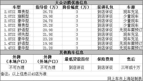 日前网上车市上海站从上海嘉安4s店了解到,目前该店大众迈腾优惠出售,详细请见下表: