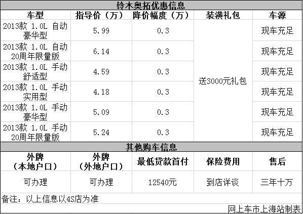 日前网上车市上海站从上海弘邦铃木4s店了解到,目前该店铃木奥拓优惠出售,详细请见下表: