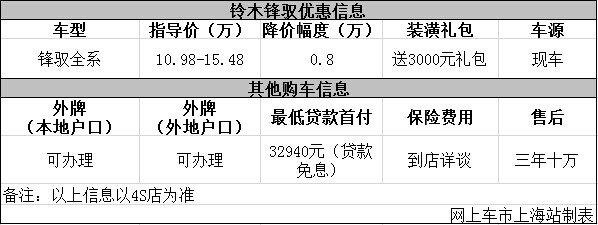 日前网上车市上海站从上海弘邦铃木4s店了解到,目前该店铃木锋驭优惠出售,详细请见下表: