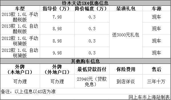 日前网上车市上海站从上海弘邦铃木4s店了解到,目前该店铃木天语SX4优惠出售,详细请见下表: