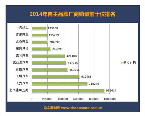 2014年,自主品牌销售624.19万辆,同比增长10.9%,占乘用车销售总量的33.9%,占有率同比下降0.6%。五菱、长安、长城等分列自主销量前十,而此十家总计超440万辆的乘用车销量,也占自主品牌乘用车全年销售总量的70.5%。