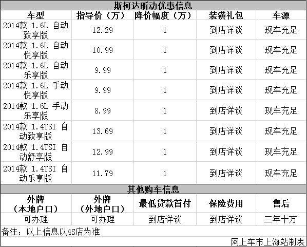 日前网上车市上海站从上海瑞晶斯柯达4s店了解到,目前该店斯柯达昕动优惠出售,详细请见下表: