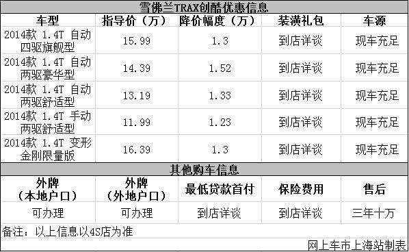 日前网上车市上海站从上海逸隆雪佛兰4s店了解到,目前该店雪佛兰TRAX创酷优惠出售,详细请见下表: