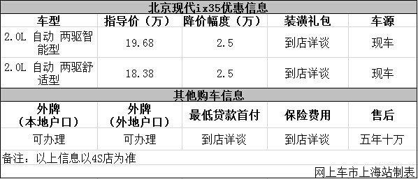 日前网上车市上海站从上海联诚现代4s店了解到,目前该店现代ix35优惠出售,详细请见下表: