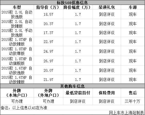 日前网上车市上海站从上海冠隆标致4s店了解到,目前该店标致508优惠出售,详细请见下表: