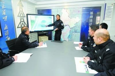 孙辉(中)和同事们正在研究布控套牌车通讯员郑小平 摄