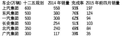 手握多个合资品牌,是“国家队”制定宏伟目标的底气所在。过去五年,合资品牌也基本上达到预期。问题主要出现在本土品牌项目上,五年前,六大车企都纷纷表示,“十二五”期间,本土品牌将是重点发展项目,其中以一汽尤为突出,按照规划,至今年底,一汽集团的本土品牌销量要突破200万辆,现在看来,差距在100万辆以上。借助于SUV的抢眼表现,今年前四个月,“国家队”的本土品牌销量大有起色,但此前挖下的“坑”过于巨大,短短半年内填满,几无可能。