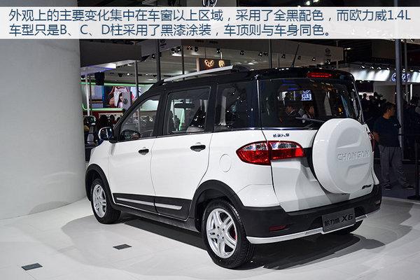 欧力威X6在外观方面增加了些许跨界元素,配备车顶行李架以及外挂式备胎,增添了不少跨界风格的设计元素。该车外观颜色均为双色搭配,其中车身上部是黑色,车身下部的颜色有白、蓝、红三种可选。据悉,欧力威X6的长宽高分别为4035/1735/1720mm。同时新车的最小离地间隙提升到了185mm。