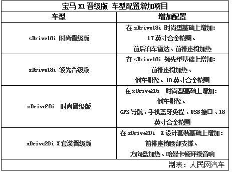 华晨宝马X1晋级版是针对现款X1车型布局进行调整后的新车型。在售的现款X1除了保留入门sDrive18i手动型和顶配的xDrive28i X设计套装外,其他7款老车型将被4款X1晋级版取代。