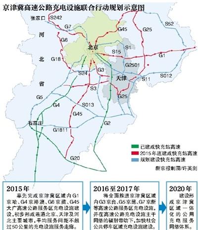2016年至2017年,将全面推进京津冀区域内G3京台、G5京昆、G7京新等高速公路服务区充电设施,并在高速公路充电设施主干网络的辐射带动下,加快社会公共停车区域充电设施建设。到2020年,建设形成京津冀区域一体化的公用充电服务网络体系。