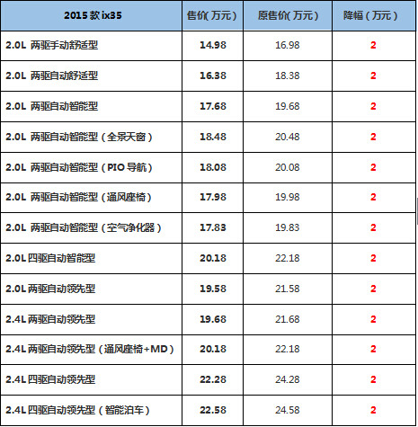 现在,两款SUV明星车型主动放下身段,以诚意十足的超值价格让利用户,真是值得称赞。调整后的ix35售价区间为14.98万-22.58万元,各车型均有高达2万元的直接降幅。在坚守原有产品价值标准的前提下,将起步价格直接下探到15万以内,让消费者用15万元就能将一辆“SUV热销神车”轻松收入囊中,势必又会掀起都市SUV新高潮!