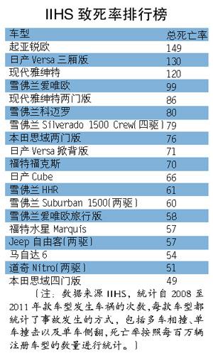 近日,美国公路安全保险协会(InsuranceInstitute for Highway Safety,简称IIHS),公布了美国2008至2011年款车型发生车祸驾驶员死亡率报告,列出19款车致死率最高的车型。根据统计,致死率最高的三款车型分别为起亚锐欧、日产Versa三厢版以及现代雅绅特四门版。