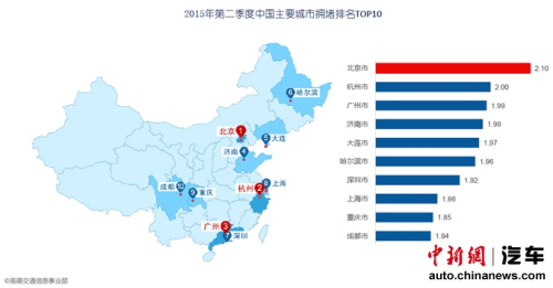 中新网8月25日电 今日,高德发布了《2015年第二季度中国主要城市交通分析报告》。报告显示,2015年第二季度,全国重点城市拥堵排名北京蝉联榜首,而其它国内十大堵城依次为杭州、广州、济南、大连、哈尔滨、深圳、上海、重庆、成都。环比上季,全国各大城市拥堵全线飘红,广州拥堵加重幅度最大;广州、大连、深圳、成都新入拥堵城市Top10榜单,而天津、南宁、石家庄、武汉则出榜。