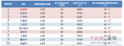据报告数据显示,第二季度城市拥堵Top10榜单北京再次夺得榜首,高峰拥堵延时指数2.10,意味着高峰出行是畅通下花费时间的2.1倍,也就是说平均每出行1小时,就会严重堵车近32分钟。而在一二线城市的通勤高峰期出行,花费在拥堵上的时间基本上会占到行程总时间的50%以上,而这些时间如果用当地的平均工资来换算,其拥堵成本是十分可观:以北京为例,北京月平均工资6463(据社保部门最近公布的上年度平均工资),折合到每小时为37元(按每月22个工作日,每日8小时计算),那么因拥堵造成的时间成本为19元,一天两次出行付出的成本接近40元,在北京通勤每月多付出的拥堵时间成本代价近1千元。