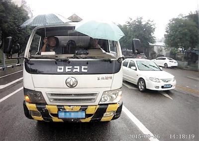 重庆晨报讯 记者 陈翔 摩托车装伞遮阳避雨,属于违法行为,你也许见过,可你见过开汽车撑伞的吗?前天,渝北的货车驾驶员杨师傅就遇到了囧事:他驾驶的危化品运输车挡风玻璃爆裂,又逢下雨,他和副驾驶竟然撑起雨伞继续行驶。