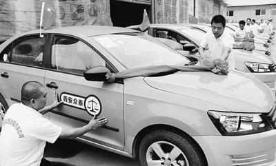 国庆期间,西安众泰出租汽车有限公司从外地购进的47辆新车到货,股东们为新车贴上公司的标识。