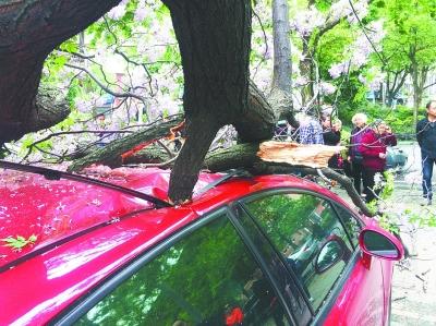 昨天中午,园林部门投保的保险公司工作人员赶来,对现场进行了勘查取证,之后,园林部门将倒掉的枝干拖离现场。