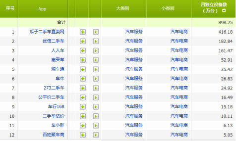瓜子二手车3月表现同样得到了第三方权威数据机构的认可。国内知名第三方数据咨询机构艾瑞咨询3月APP月独立设备数显示,在汽车电商领域,3月瓜子二手车APP月度独立设备数增加至416万台位列第一,排名第二的月独立设备数为183万台,排名第三的月独立设备数为161万台。瓜子二手车APP月独立设备数达第二名的两倍以上,持续保持了汽车电商品类中排名第一的位置。