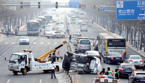 石景山路为东西走向,路中间20多米长的隔离护栏被撞倒,事故车辆已被拖至路边,右侧车门上有不少划痕,车头挡板全部碎裂,路上到处是车辆零件及被毁坏护栏的残骸。因道路比较狭窄,事发地点附近车辆拥堵近百米,交警正在现场疏导过往车辆。