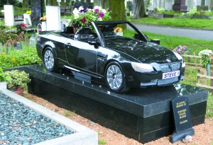 英国车迷史蒂夫·马什去年去世。为表现他生前对汽车的热爱,马什的家人为他订做一个“宝马”车造型的墓碑。