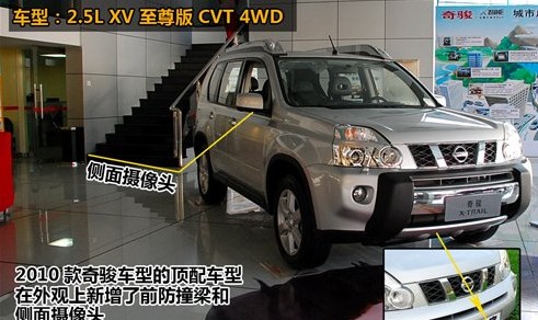 相比逍客,2010款奇骏的变化更实用一些,特别是增加了一款配置最高的2.5L四驱至尊版车型,厂家指导价为26.98万元,外观上和其他车型的区别就是增加前后的越野包围,而在配置上则有DVD导航、侧面摄像头等。
