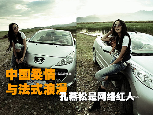 在网络中迅速走红的美女孔燕松,逐渐吸引了各媒体的关注,拍写真、接受采访让她忙的不亦乐乎。香车美女“不分家”是业内的“潜规则”。不久前,某网络媒体就邀请孔燕松为车当了次模特,在外形浪漫的法国标致206CC敞篷小跑车上秀起了美腿。东方柔情与法式浪漫有了完美的结合。
