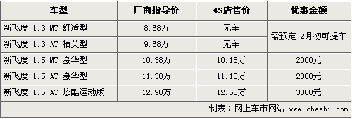 据广汽本田4S店销售人员介绍,飞度目前的优惠一直保持在2000元-3000元,其中1.5运动版最高优惠3000元,其他车型可优惠现金2000元。现车方面1.3L现车较少,如果预订的话需要在2月初才能提车。我们推荐购买1.5排量车型,无论从配置还是动力方面,它都能满足日常需要。