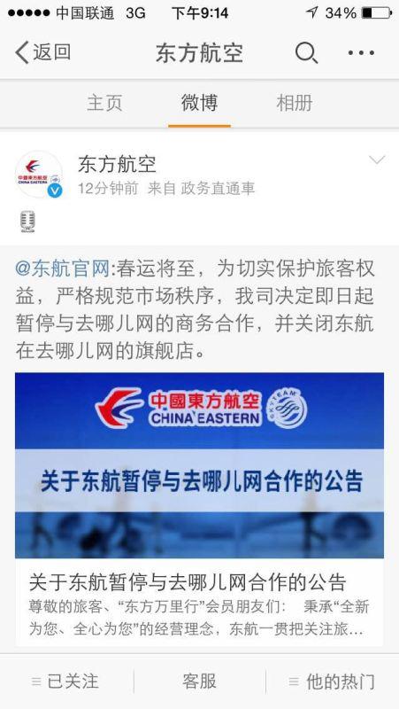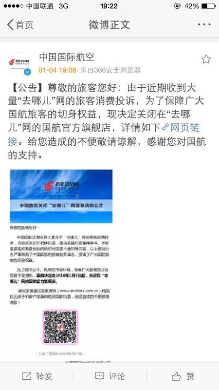 国航与东航在声明中表示,由于近期收到大量去哪儿网的旅客消费投诉,为了保障广大国航旅客的切身权益,现决定关闭在去哪儿网的国航官方旗舰店。
