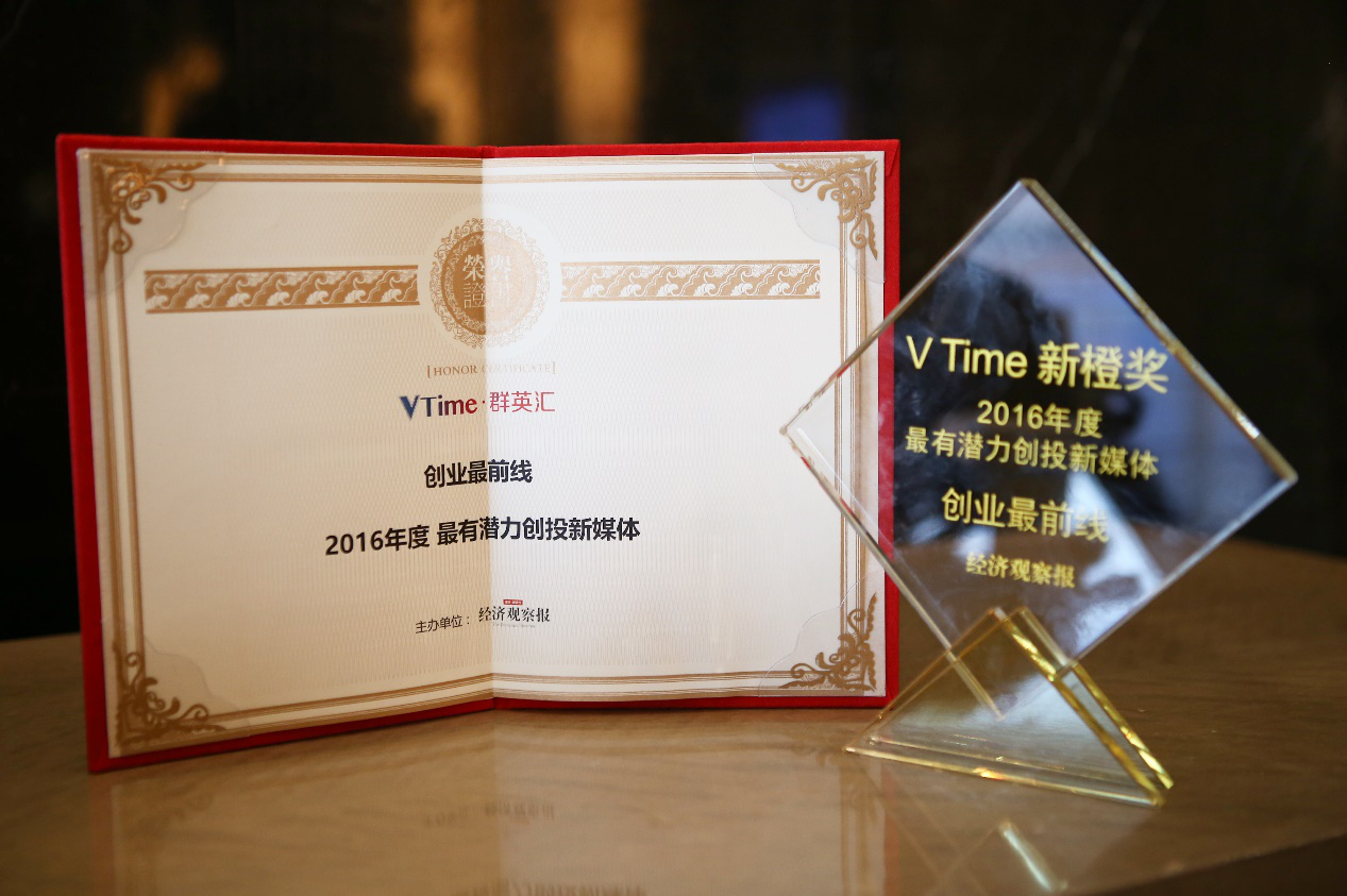 (图:创业最前线获Vtime 新橙奖2016年度“最有潜力创投新媒体”大奖)