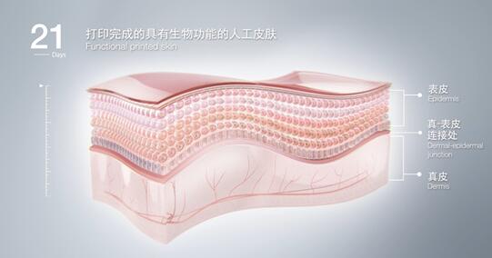伽蓝集团凭借3D生物打印技术,只需要21天,就能打造出一块具有完整结构和功能的皮肤组织,包含真-表皮连接处、真皮和具有多层结构的表皮