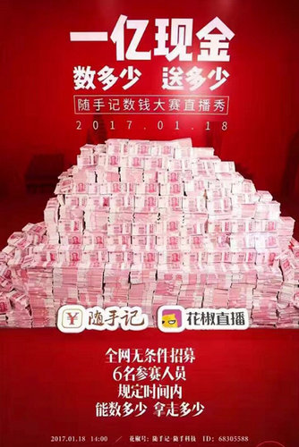 中新网1月17日电 近日,花椒直播宣布春节期间将向用户发放价值1亿的现金红包,消息一出引起强烈期待。究竟1亿现金到底有多少?1月18日,花椒直播携手随手记直播数1亿现金,6位网友现场数钱,数对就送,5位花椒主播全程直播,共同见证“1亿小目标”。