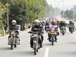 下午2时,在一辆警车开道下,几百辆各式型号、各种颜色的摩托车跟随其后。在绵延几公里的“铁骑长龙”中,有的摩托车主大声播放着流行音乐,整个队伍洋溢着欢乐气氛。