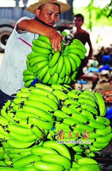 老莫是徐闻县北岭村的种植散户,种了8亩地,全部是香蕉“今年才过‘五一’,香蕉价格就开始大跳水,我还比较幸运,收得早,1斤卖了七八毛钱,算是回了本,最近才收成的就惨了。”他给记者算了笔账:一亩地180株蕉苗,加上农肥、打桩的费用,成本要4000多元,按30斤/株的产量算,大约0.8元/斤的价格才能回本。
