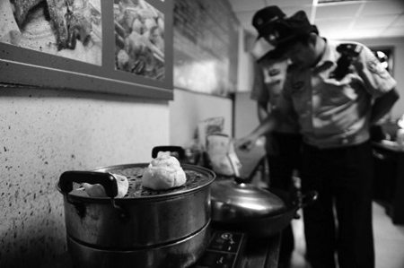 一小时后,刘茂广从热气腾腾的蒸锅里取出包子,让记者品尝。