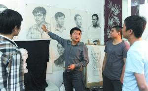 向云杰和朋友们一起切磋美术技法。 记者 杨新宇 摄