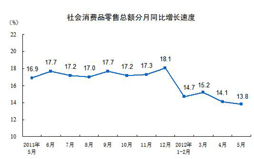 中新网6月9日电 国家统计局今日公布的数据显示,2012年5月份,社会消费品零售总额16715亿元,同比名义增长13.8%(扣除价格因素实际增长11%,以下除特殊说明外均为名义增长)。其中,限额以上企业(单位)消费品零售额7923亿元,增长14%。