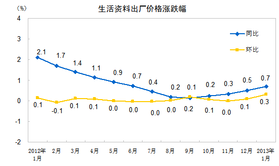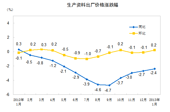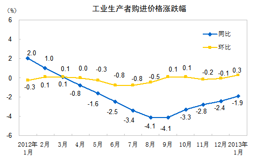 2013年1月份,全国工业生产者出厂价格同比下降1.6%,环比上涨0.2%。工业生产者购进价格同比下降1.9%,环比上涨0.3%。